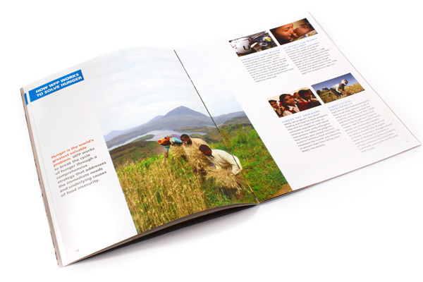 The World Food Program is the food-aid arm of the United Nations devoted to fighting hunger worldwide. As WFP's work strives to provide people with food for growth, feature images become larger throughout the report. A band in WFP's blue marks the different sections, while pull quotes introduce each.